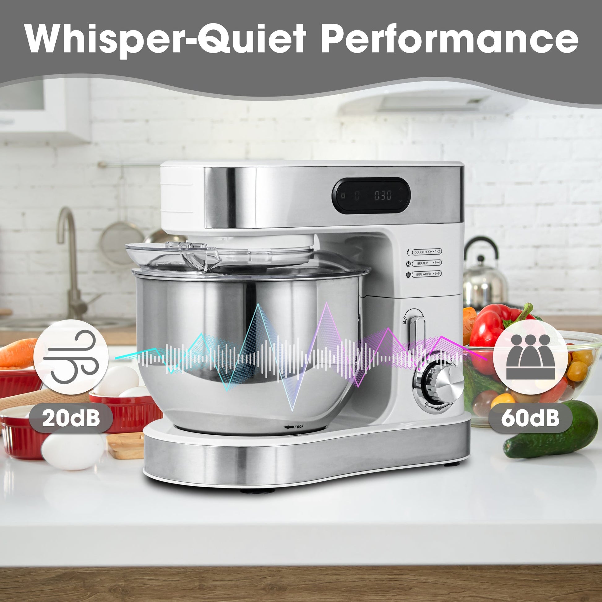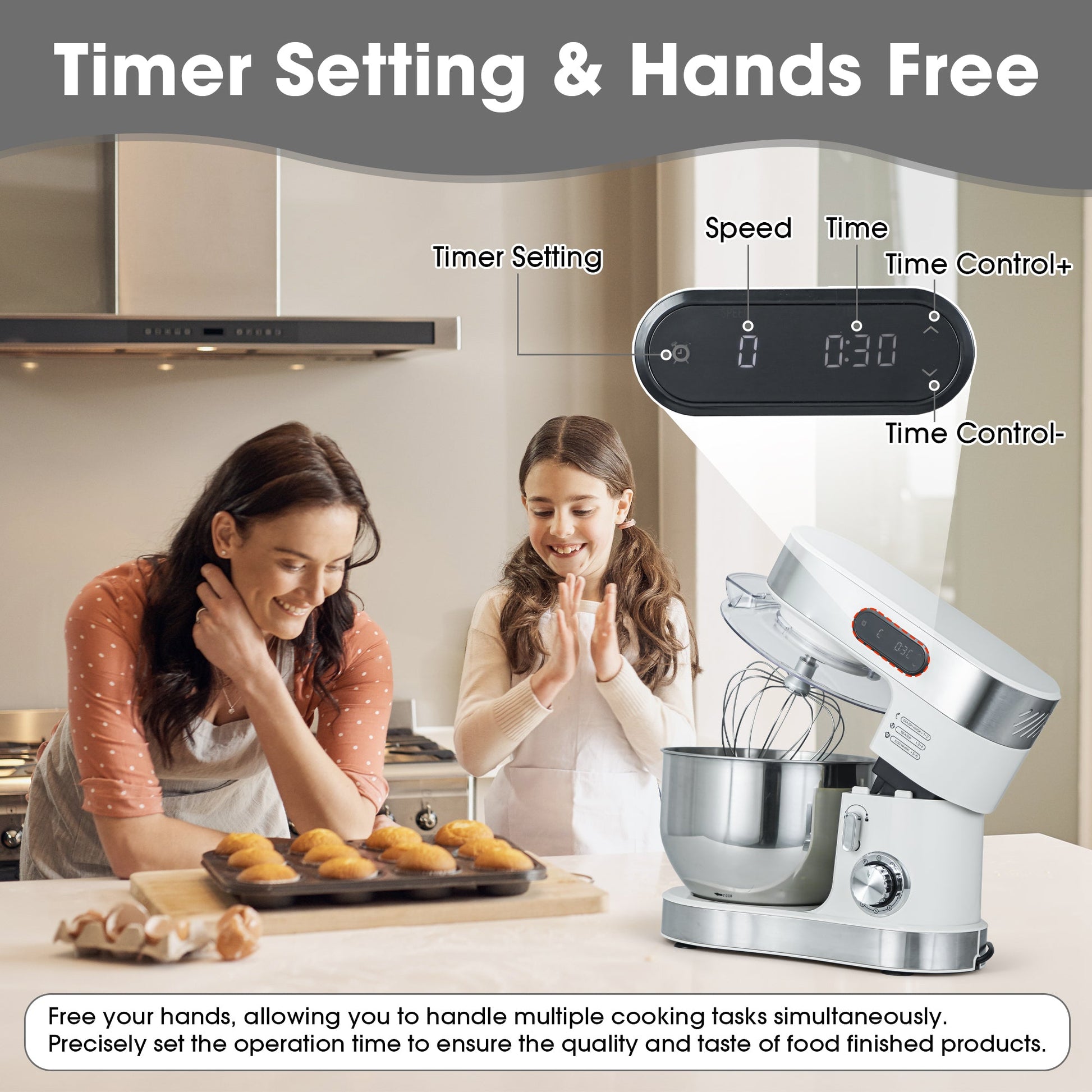 Built for home baking, this stand mixer combines a powerful copper AC motor with smooth, quiet operation to handle heavy doughs and big batches with ease. The 5.5L stainless steel bowl supports kneading, whipping, and mixing all in one machine. An LED display shows status at a glance, with 1–6 + Pulse speed options and a built-in timer for hands-free control. Includes three essentials: dough hook, wire whisk, and flat beater—ready for everyday baking.