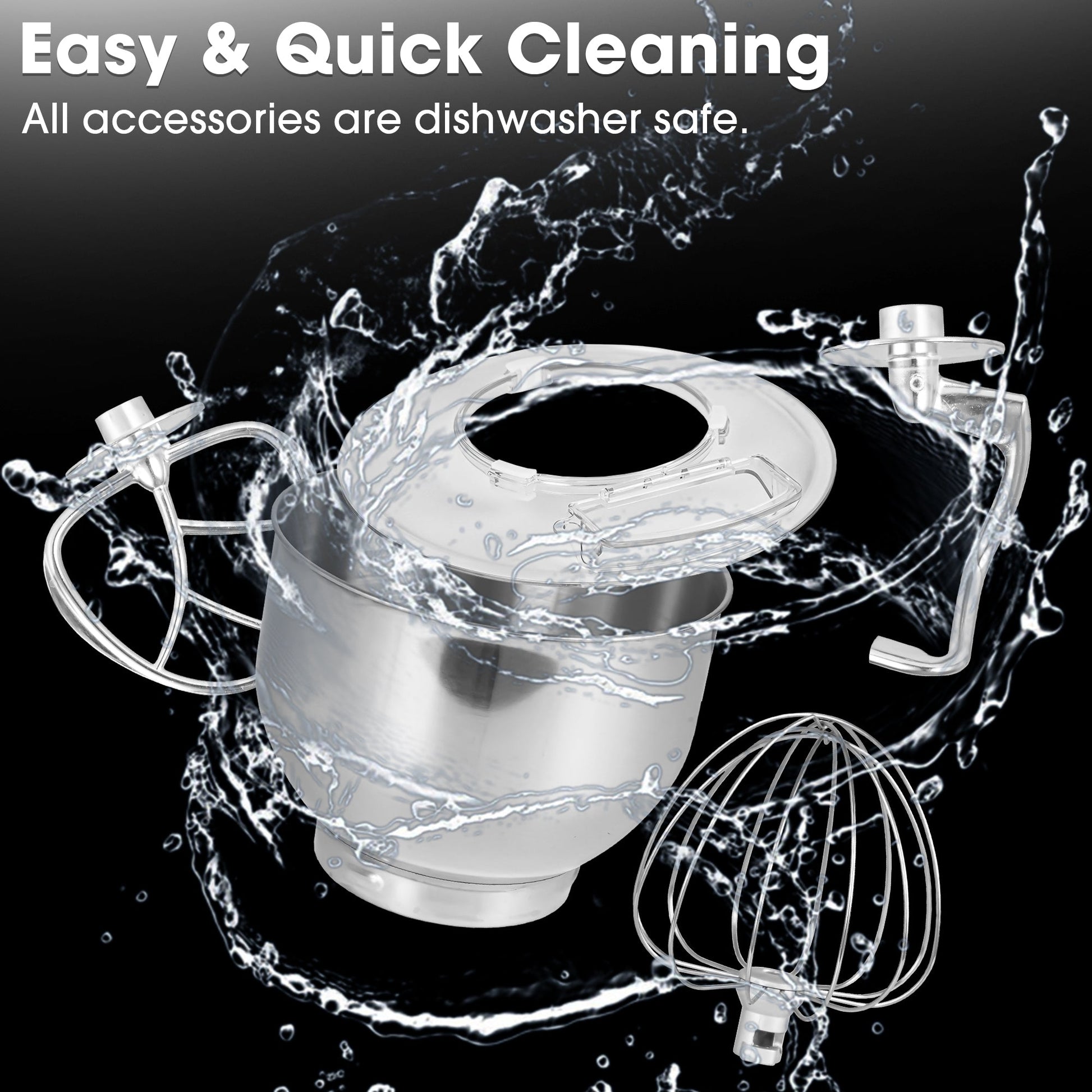 【Complete Accessory Set】: Includes a dough hook, egg whisk, mixing bowl, splash guard, and scraper for all baking tasks, all dishwasher-safe.
